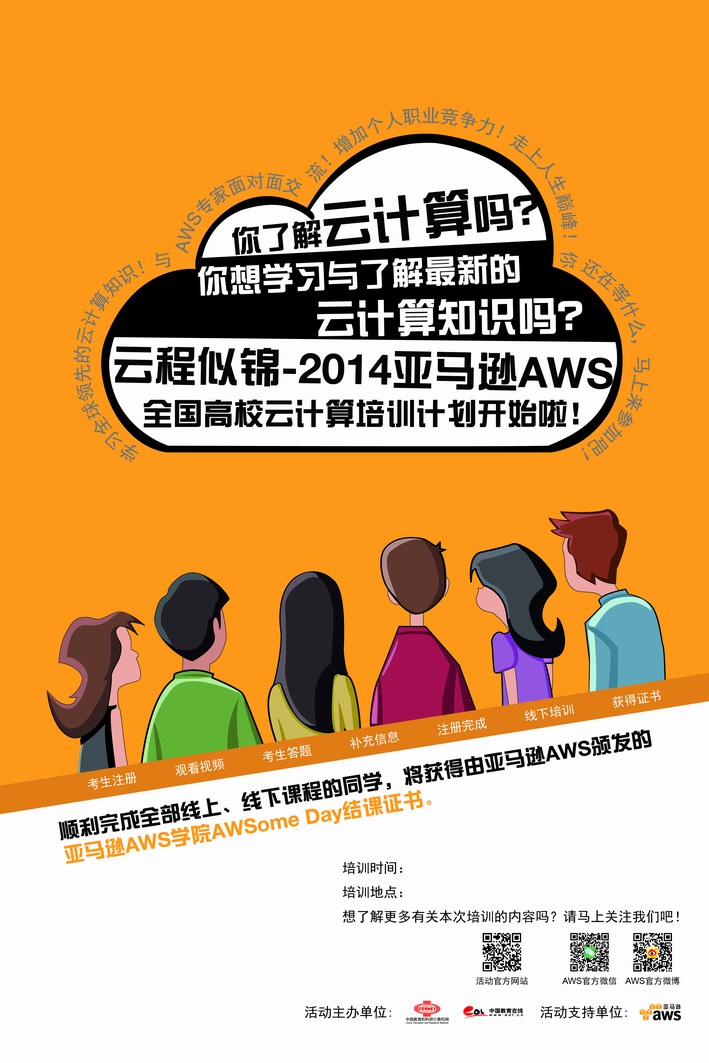 為了能夠更加有效地培育和儲備科技創新人才,幫助大學生充分掌握最先進的IT技術,在嚴峻的就業形勢面前更具競爭力,最終實現順利就業,由?中國教育和科研計算機網、中國教育在線特聯合全球知名IT企業亞馬遜公司面向全國大學生的?“云程似錦——2014亞馬遜AWS全國高校云計算培訓計劃”正式登陸西電。活動時間為10月16日晚18:30至21:30,地點為大活小劇場。屆時,將由亞馬遜公司的著名講師為大家講解關于云計算方面的知識。具體情況如下:?