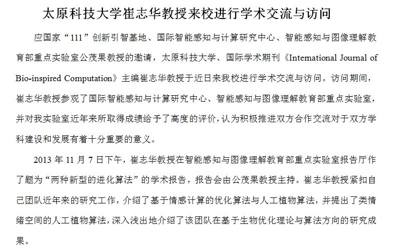 太原科技大學崔志華教授來校進行學術交流與訪問 2013-11-08 17:40:00 瀏覽次數: 上一篇文章:關于召開2014年空間測控通信創新探索基金指南發布會的通知 下一篇文章:英國諾丁漢大學Guoping Qiu教授報告通知