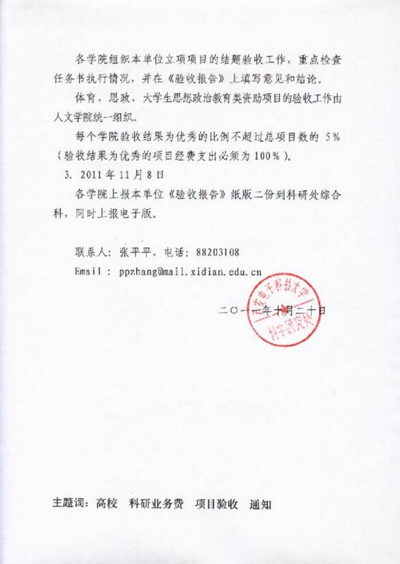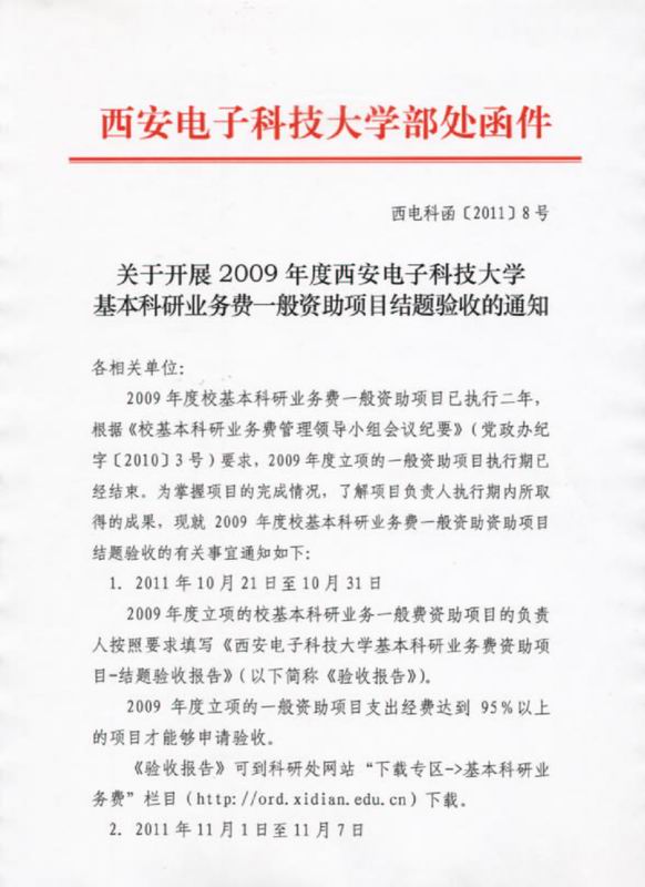 關于開展2009年度基本科研業務費資助項目結題驗收的通知 2011-10-24 09:38:00 瀏覽次數: 來源:http://ord.xidian.edu.cn/zytz_info.asp?bh=286&id=22 上一篇文章:加拿大Simon Fraser大學梁杰教授來我校講學訪問 下一篇文章:香港理工大學張磊博士學術報告預告