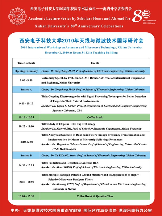 2010天線與微波技術國際研討會日程安排和專家介紹 2010-12-01 22:02:00 瀏覽次數: 2010天線與微波技術國際研討會將于2010年12月2日在西安電子科技大學舉行。(完) 來源:http://oice.xidian.edu.cn/html/news/conference/2010/1130/1211.html 上一篇文章:青年教師出國研修二批名單公布 西電15人入選 下一篇文章:關于召開2011年度國家自然科學基金申請工作安排動員大會的通知