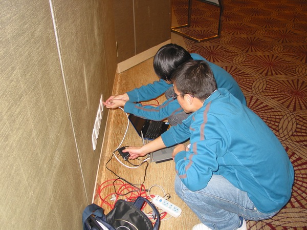 本次會議對無線網絡要求很高,專家開會時幾乎人手一個筆記本,隨時上網,圖為會議志愿者正在調試現場無線網絡