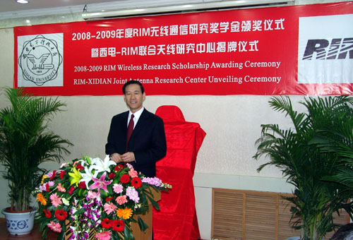 會談結束后,雙方舉行了“RIM無線通信研究獎學金”頒獎儀式和西電-RIM天線聯合研究中心揭牌儀式。儀式由高新波處長主持,在獎學金頒獎儀式上,段寶巖校長和RIM公司Adele Newton女士為獲獎學生頒發證書并分別致辭,勉勵學生努力學習,在今后的學習工作中取得更大的成績;通信工程學院博士生李靖作為獲獎學生代表也發表了獲獎感言并致謝。本年度,共有來自通信工程學院、電子工程學院和機電工程學院的10名博士生獲得RIM無線通訊研究獎學金。