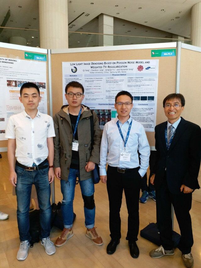 在本次會議上,媒體實驗室共報告了六篇論文,其中,鄭喆坤教授作了題為《PATCH-BASED STEREO MATCHING USING 3D CONVOLUTIONAL NEURAL NETWORKS》和《FULLY CONVOLUTIONAL SIAMESE FUSION NETWORKS FOR OBJECT TRACKING》海報展示。 付慶濤博士作了題為《LOW LIGHT IMAGE DENOISING BASED ON POISSON NOISE MODEL AND WEIGHTED TV REGULARIZATION》和《WEIGHTED CHROMA DOWNSAMPLING AND LUMA-REFERENCED CHROMA UPSAMPLING FOR HDR/WCG VIDEO CODING》的海報展示。 于勝韜博士作了題為《INTENSITY-GUIDED DEPTH UPSAMPLING USING EDGE SPARSITY AND WEIGHTED L0 GRADIENT MINIMIZATION》的海報展示。年子成碩士作了題為《HIGH-QUALITY VIRTUAL VIEW SYNTHESIS FOR LIGHT FIELD CAMERAS USING MULTI-LOSS CONVOLUTIONAL NEURAL NETWORKS》 的海報展示。并在論文的展示期間與國內外學者就相關問題進行了深入交流與討論。