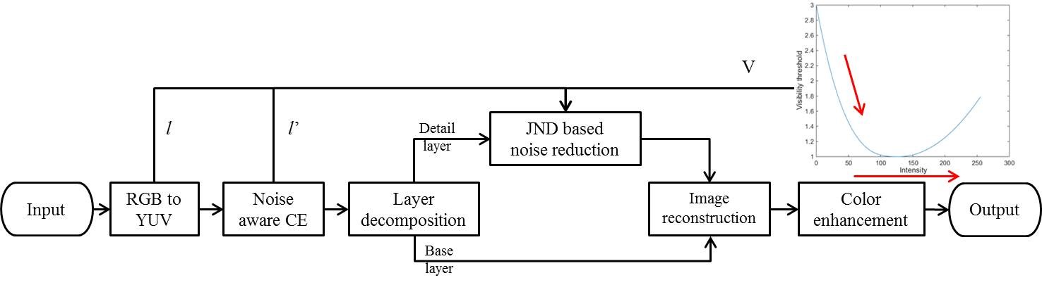 Fig. 1 Framework of the proposed method. V is visibility threshold by just noticeable distortion (JND). l and l' are intensities in the original image and its enhanced image, respectively. CE is contrast enhancement.