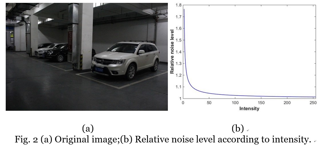 2) Noise characteristics: Noise level becomes larger in low intensity (0-10), and decreases rapidly as intensity increases as shown in Fig. 2(b).