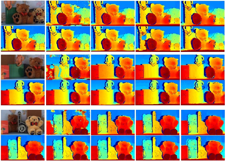 Fig. 2. Experimental results in data set [1]. From left to right: Left color image, TOF result, Stereo result, Ground Truth and Proposed. Bottom: Giulio et al. [2], Yang et al. [3], Zhu et al. [4], DalMutto et al. [5], and DalMutto et al. [6] .